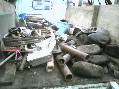 ごらんのとおり、家の周りやお庭に置きっぱなしになっていた廃品です。土管、石、ゴミ箱、中身の鉄だけになった座椅子?照明などです。
